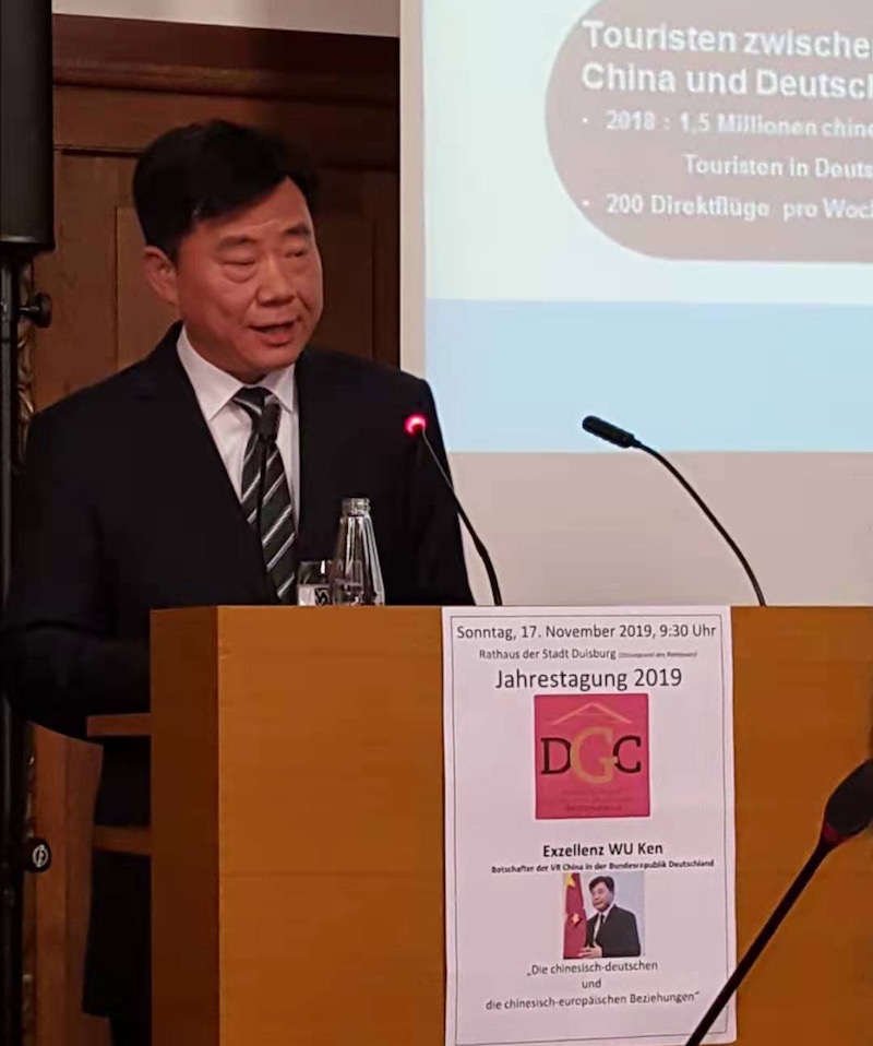 Am Sonntag wurde die Tagung mit einem Besuch des Botschafters der VR China, Exzellenz Wu Ken beehrt, der seinerseits in seinem Vortrag die chinesisch-deutschen und die chinesisch-europäischen Beziehungen beleuchtete und auch die aktuelle Thematik 'Huawei' und 'Hongkong' nicht ausließ, sondern auch offene Fragen hierzu gerne beantwortete.