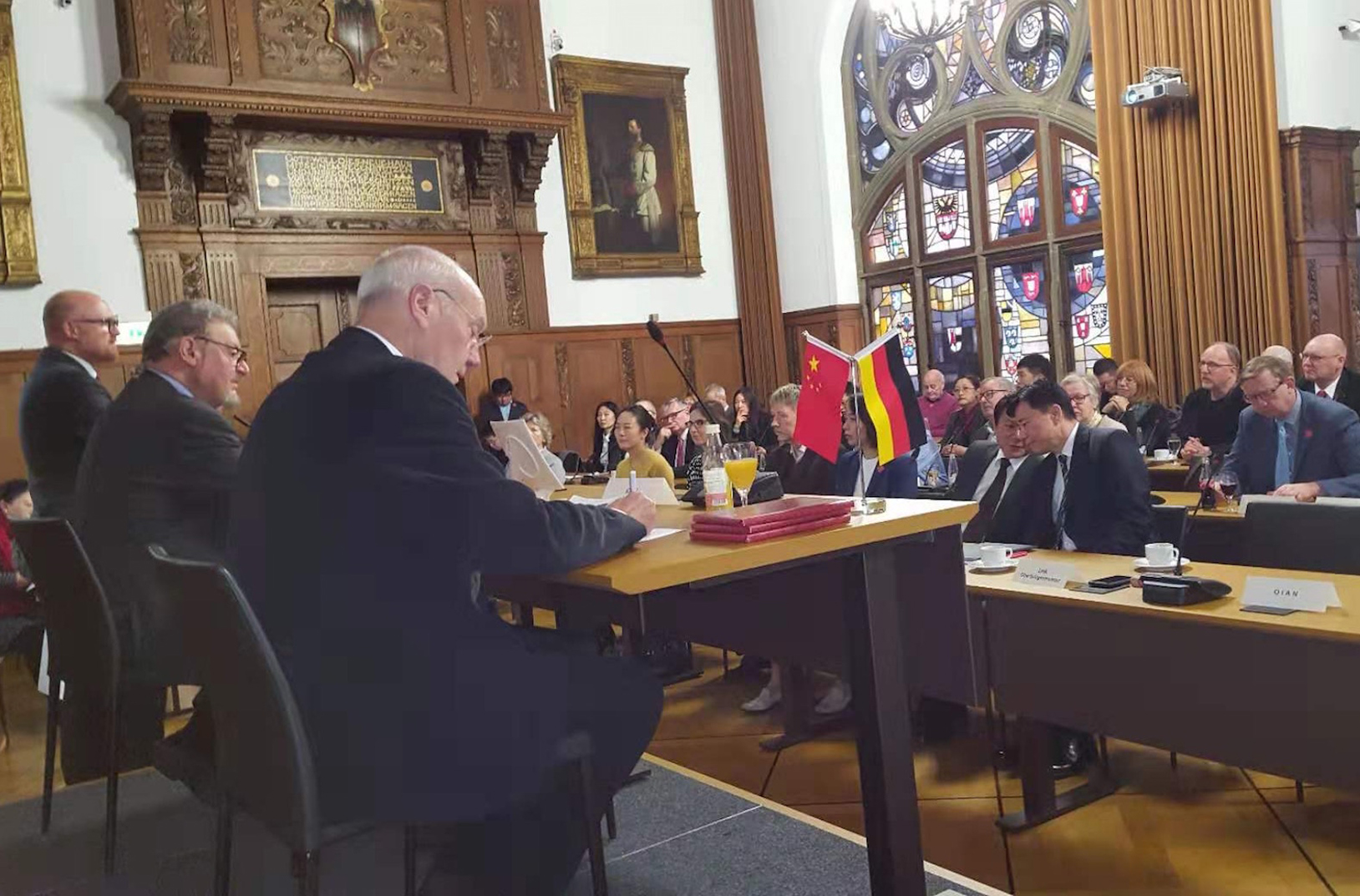 Nach einem Imbiß in der Mercatorhalle des beeindruckenden Rathauses hielt der Duisburger Sinologe und deutsche Ko-Direktor des Konfuzius-Instituts Metropole Ruhr, Prof. Dr. Thomas Heberer einen Vortrag über aktuelle Entwicklungen im Spannungsbogen China /EU-Deutschland/Amerika.